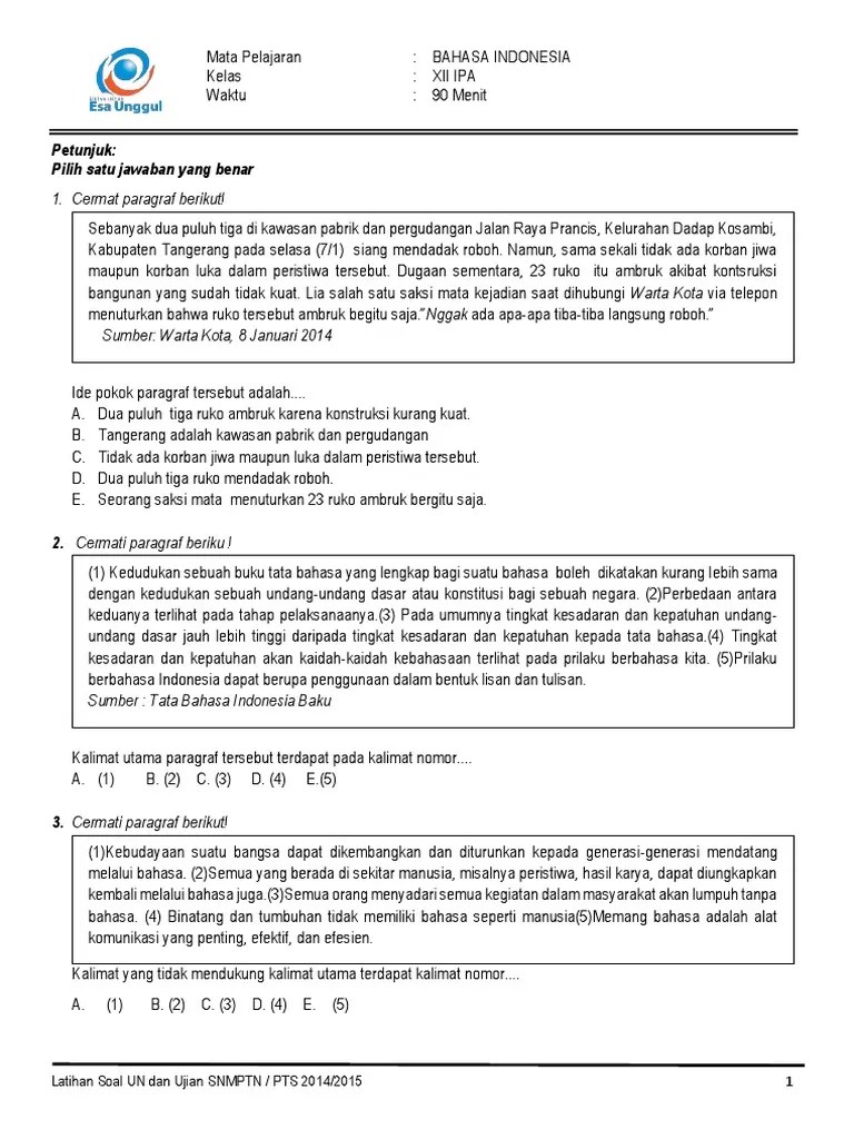 Soal un, soal unbk, soal unbk sma, soal unbk smk, soal unbk ma, latihan soal. Un sma 2014 pre indonesia kode soal doc. Inilah pembahasan soal dan jawaban latihan un dan unbk untuk smk pelajaran bahasa indonesia semester genap. Pilihlah jawaban yang paling tepat dengan memilih jawaban di depan huruf a, b, c, d, atau e! Latihan soal un bahasa indonesia.
